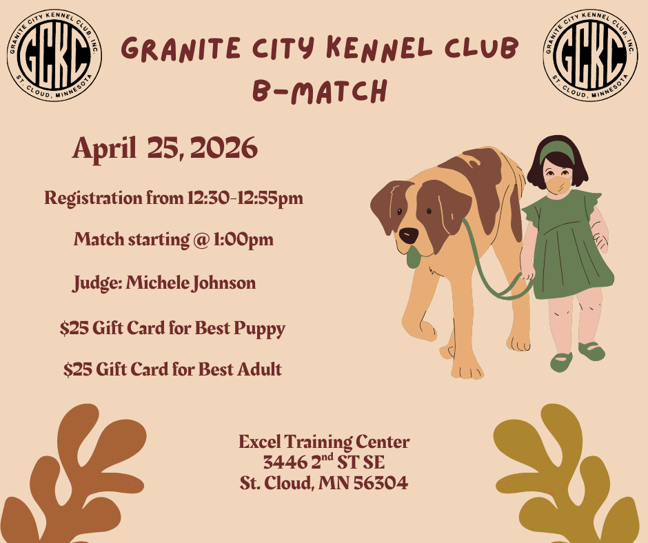 Saturday, April 25th @ 1:00pm Location: Excel Dog Training 3446 2nd St SE #1, St Cloud, MN 56304 All dogs are welcome over 4 months of age to participate. Champion dogs may not compete. This is a fun match to help dogs and handlers to hone their skills as we prepare for the show season. It is meant to be a fun event. Children are welcome to come and handle their dogs as this is an enclosed area and safe to do so but with supervision nearby. There is a $10 per entry fee. The forms will be available at the show. Registration for event is from 12:30-12:55. Prizes for best puppy in match and Best Adult in match. |